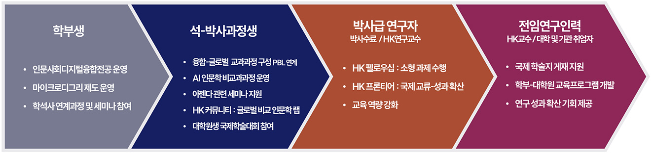 - 학부생 : 인문사회디지털융합전공 및 마이크로디그리 운영으로 AI 인문학 역량을 강화하며, 학석사 연계 과정과 세미나를 통해 대학원 진학을 유도함.