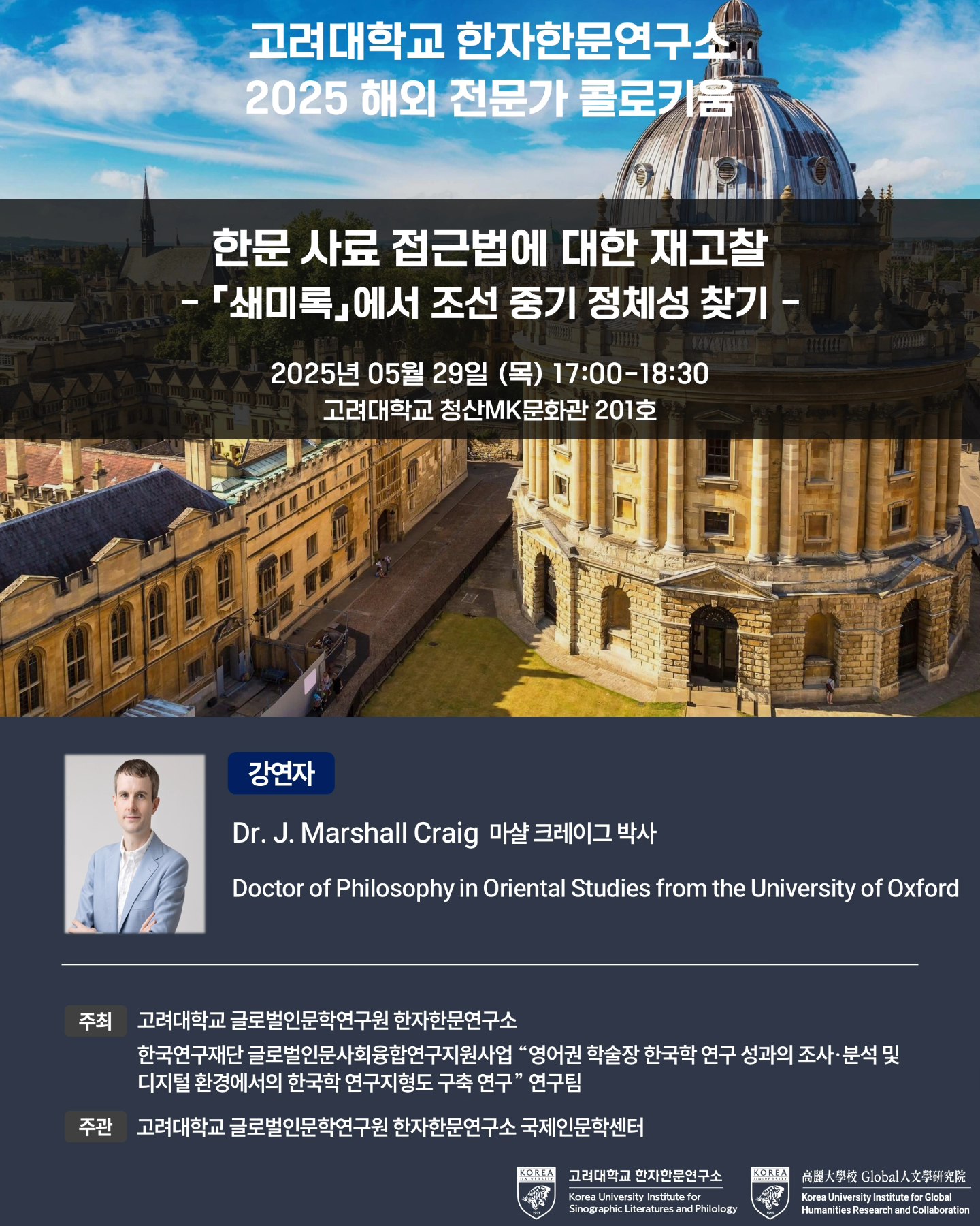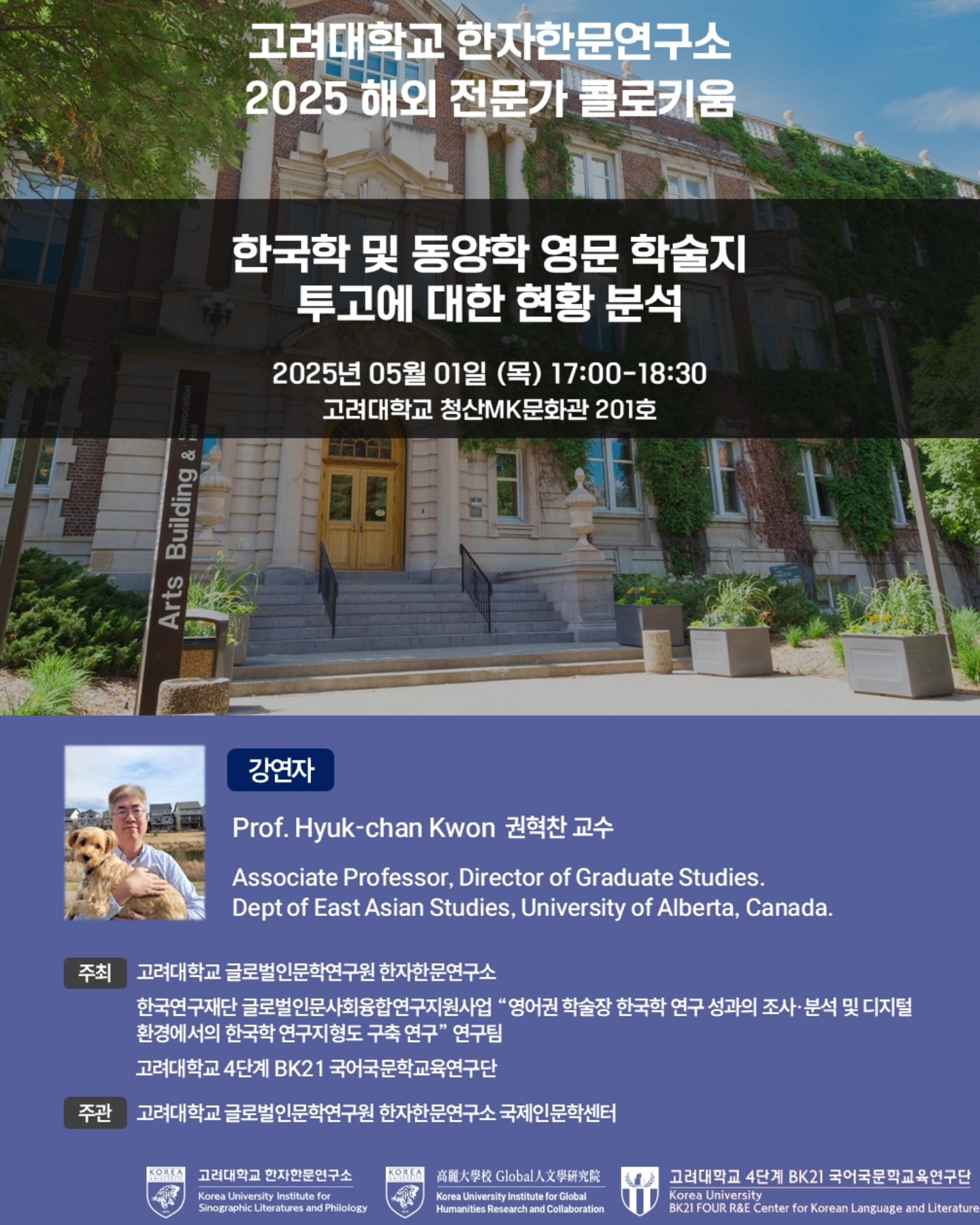 ㆍ주최: 고려대학교 글로벌인문학연구원 한자한문연구소, 한국연구재단 글로벌인문사회융합연구지원사업 "영어권 학술장 한국학 연구 성과의 조사 · 분석 및 디지털 환경에서의 한국학 연구 지형도 구축 연구" 연구팀