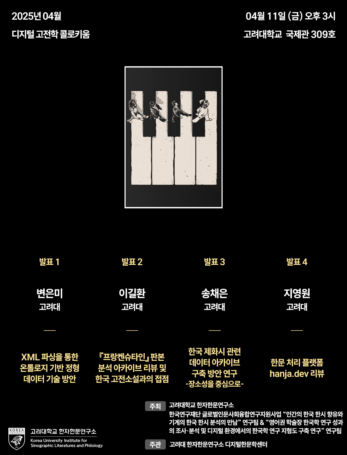 ㆍ주최: 고려대학교 한자한문연구소 / 한국연구재단 글로벌인문사회융합연구지원사업 "인간의 한국 한시 향유와 기계의 한국 한시 분석의 만남" 연구팀 / 한국연구재단 글로벌인문사회융합연구지원사업 "영어권 학술장 한국학 연구 성과의 조사 · 분석 및 디지털 환경에서의 한국학 연구 지형도 구축 연구" 연구팀