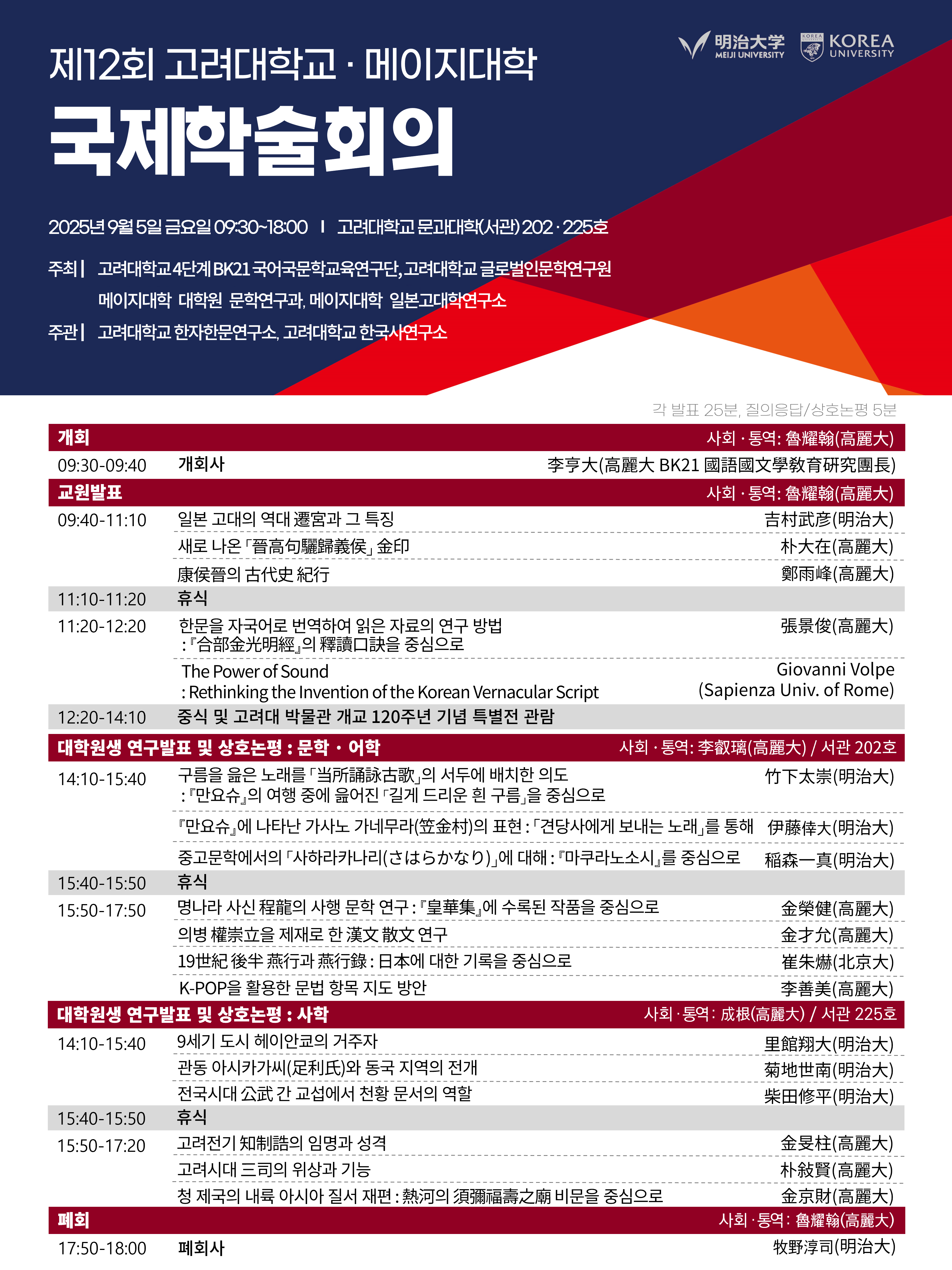 ㆍ주최: 국문과BK사업단, 글로벌인문학연구원, 메이지대 대학원 문학연구과, 메이지대 일본고대학연구소